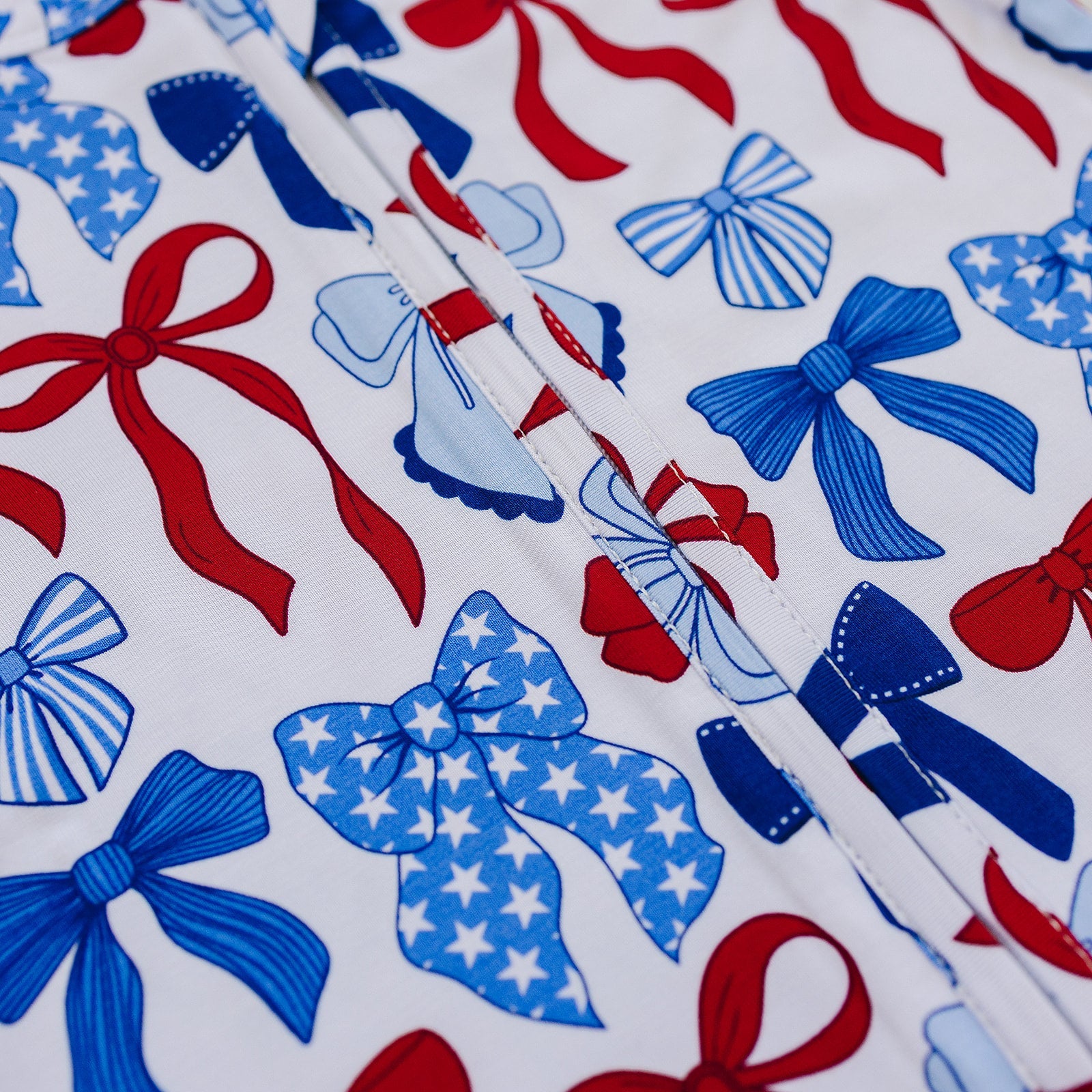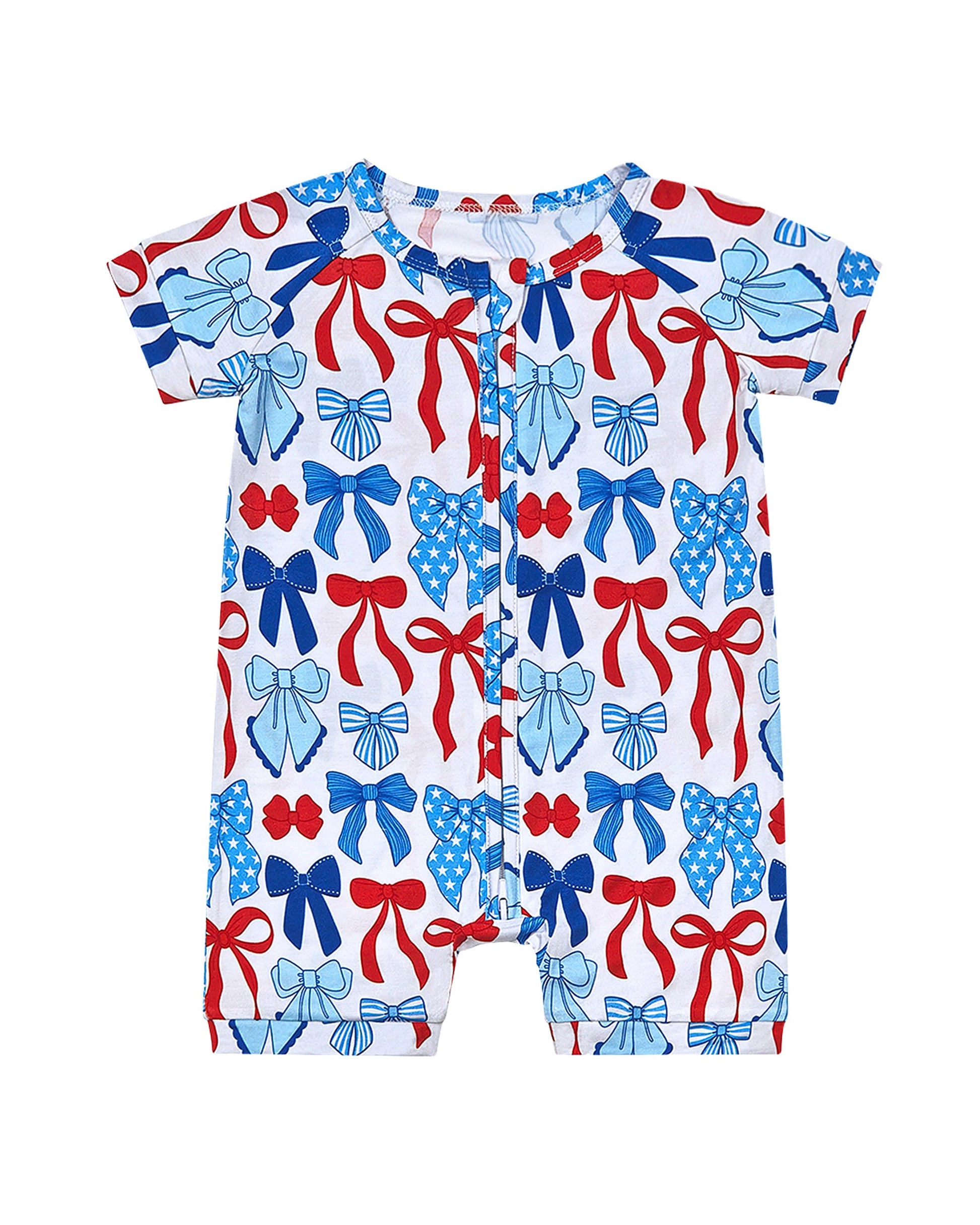 Sweet summer style with a patriotic twist — the Bamboo Shorty Romper | Red-White & Bows!