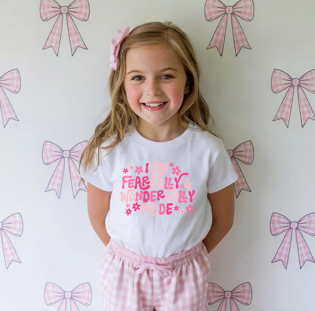 I am fearfully and wonderfully made t-shirt is for our strong little girls. Pretty in pink with a powerful scripture.