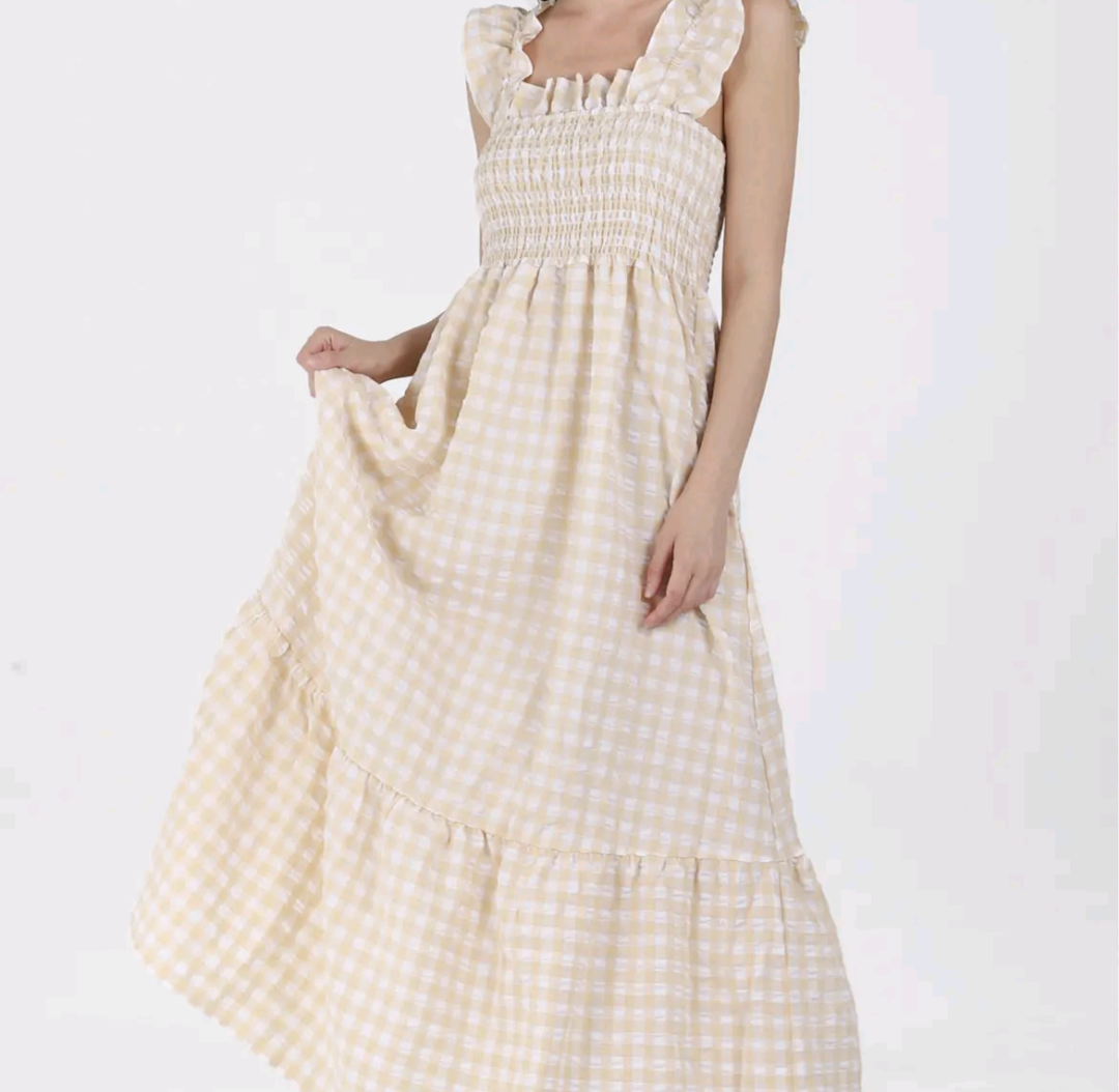 Get ready to be cute and comfy in our Women's Beige Gingham Dress! Made from stretchy and soft fabric, this ankle-length dress features a ruffle shoulder and smocked bodice for a flattering fit. Matching outfits available for you and your little one. Perfect for twinning with your mini-me! (Available in baby and toddler sizes too!)